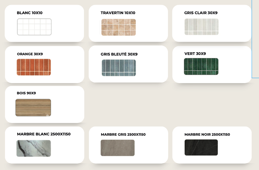 Possibilité de mixer les coloris : personnalisation de la douche ou d’un mur avec des teintes différentes (ex. un mur gris, un mur orange).